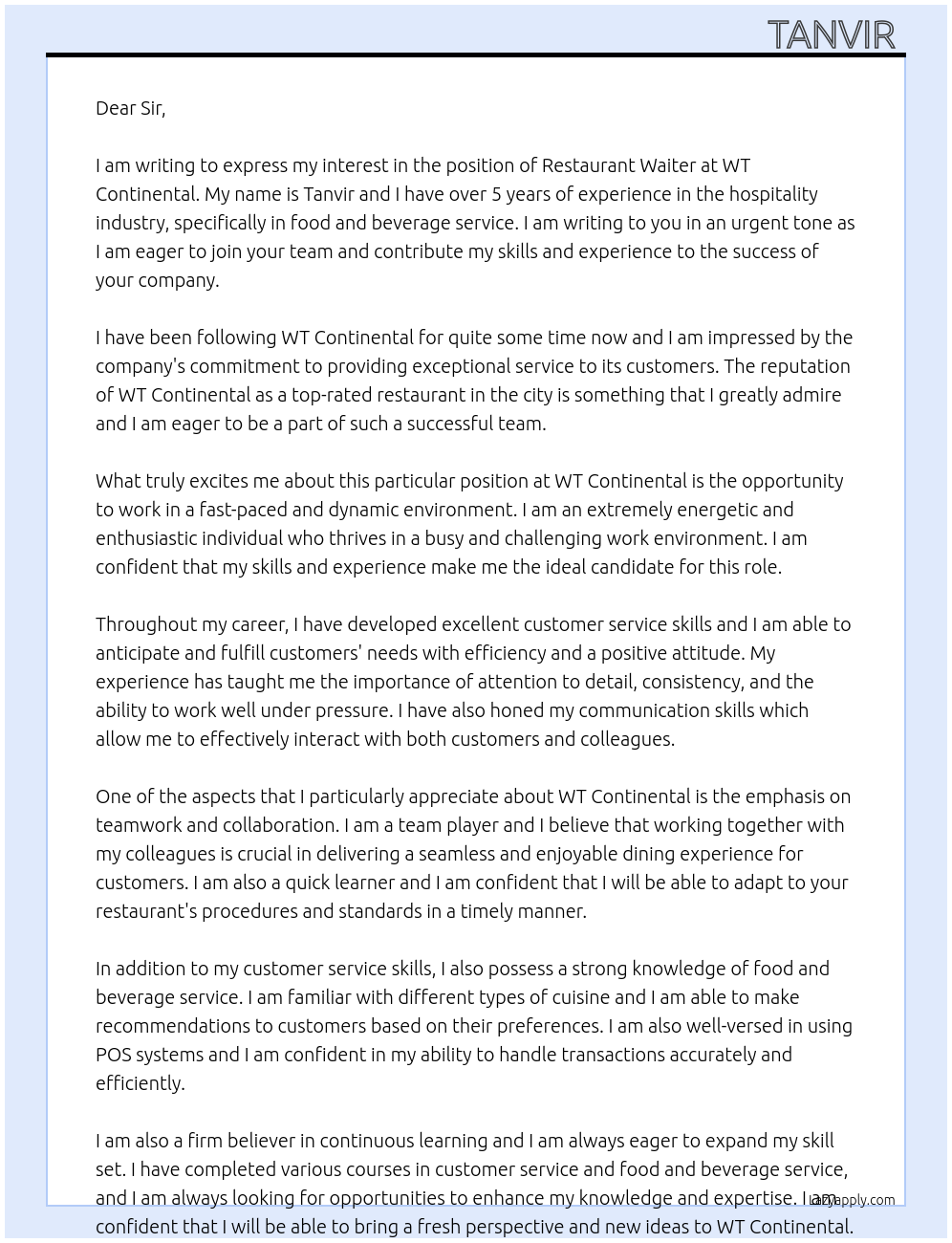 Check out these restaurant waiter cover letter sample and examples previously used by job seekers to land on job interviews as restaurant waiter. Use our AI cover letter generator to create a personalized cover letter as restaurant waiter.