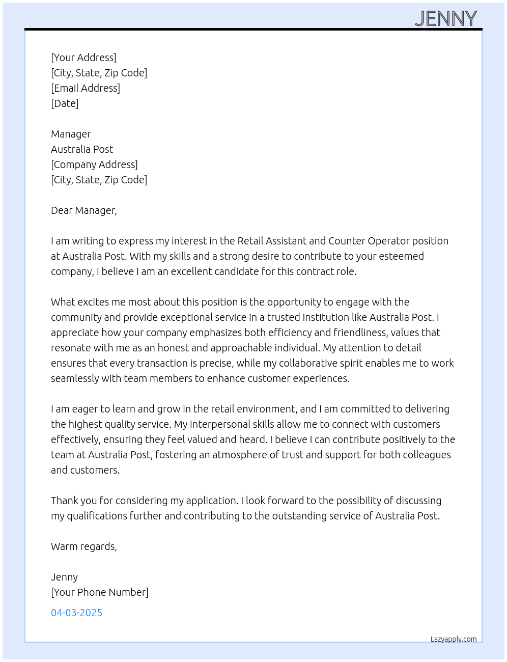 Retail Assistant And Counter Operator Cover Letter Examples And Template