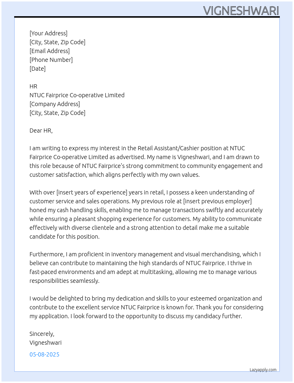 Retail Assistant/Cashier Cover Letter At NTUC Fairprice Co-operative Limited