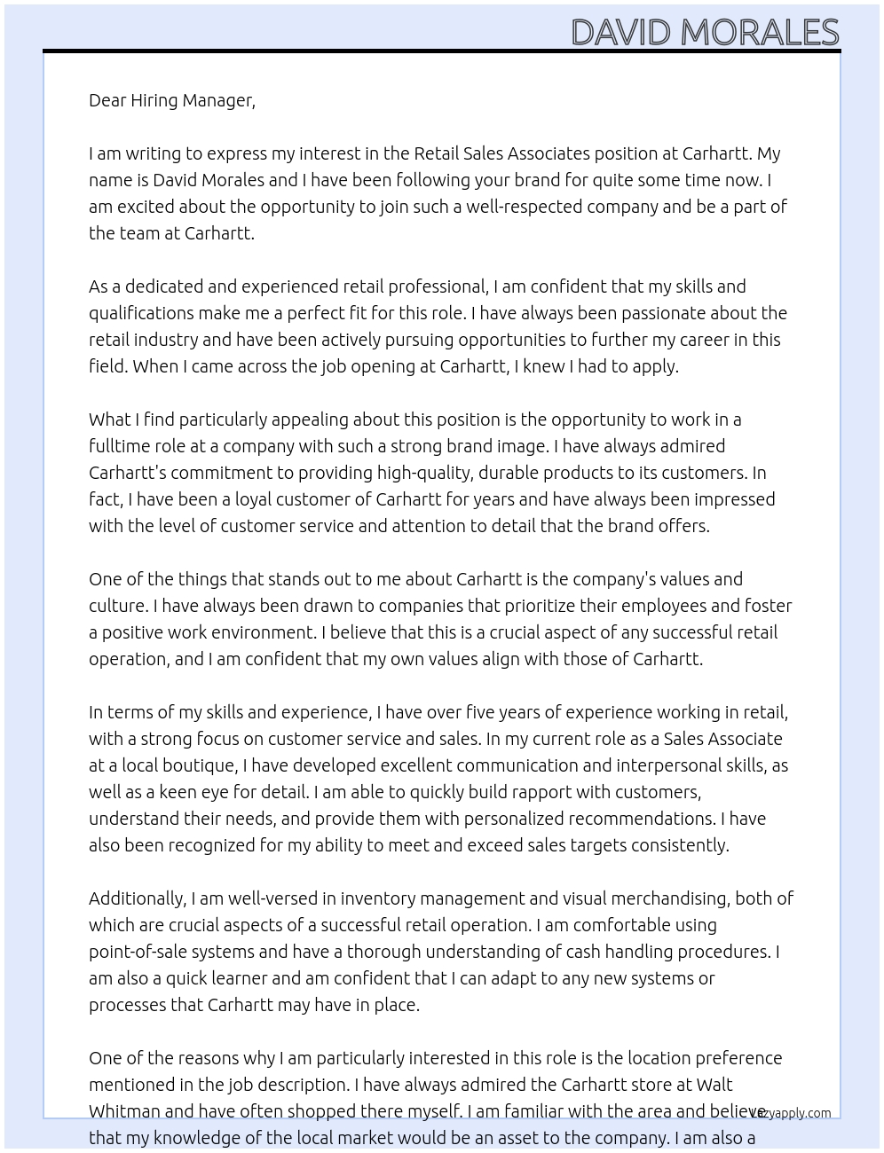 Check out these retail sales associates cover letter sample and examples previously used by job seekers to land on job interviews as retail sales associates. Use our AI cover letter generator to create a personalized cover letter as retail sales associates.