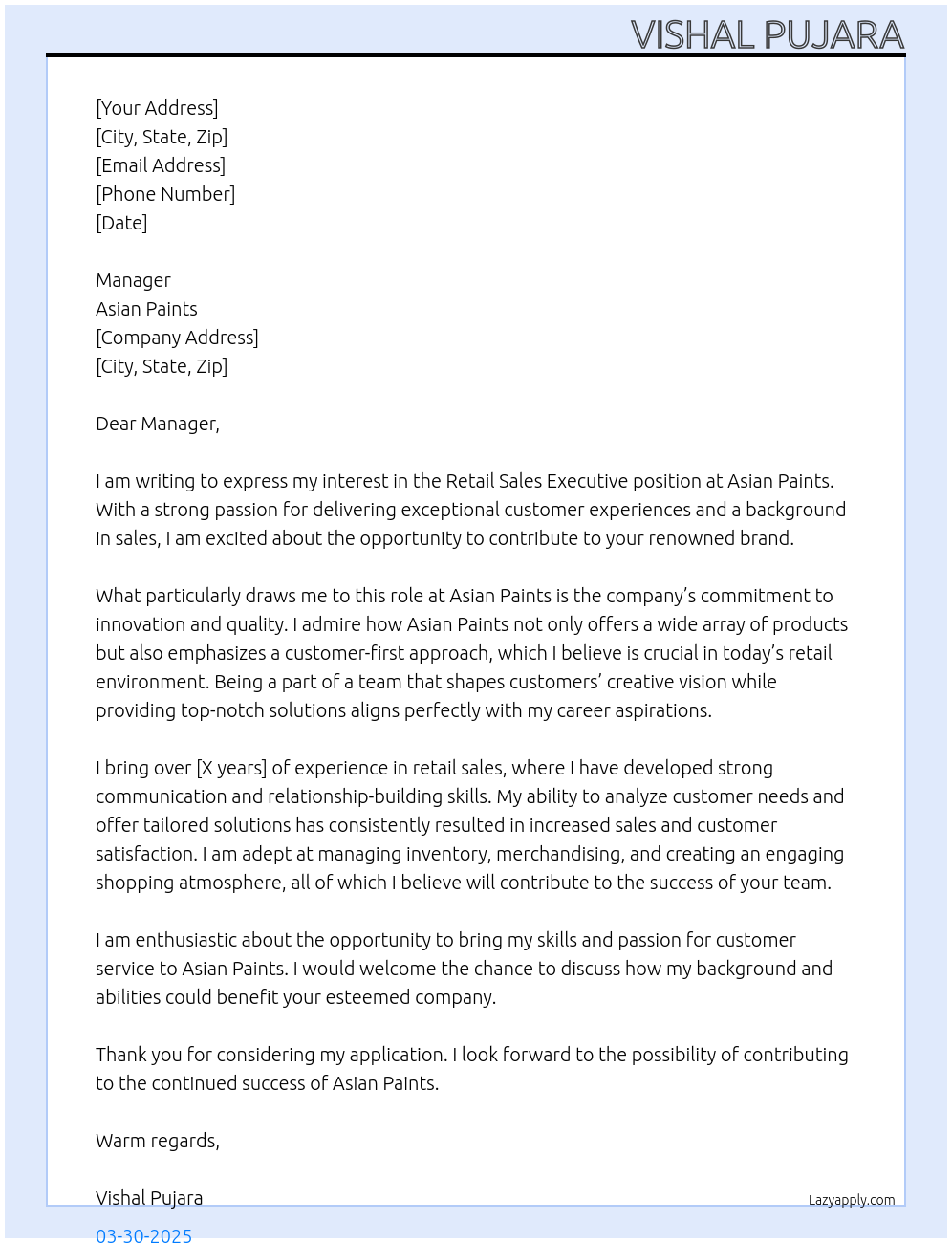 Retail sales executive Cover Letter At Asian paints