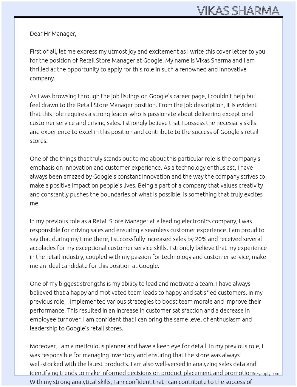 Check out these retail store cover letter sample and examples previously used by job seekers to land on job interviews as retail store. Use our AI cover letter generator to create a personalized cover letter as retail store.