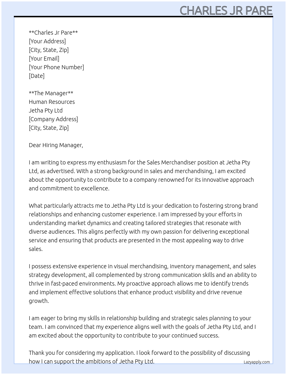 Sales Merchandiser Cover Letter At Jetha Pty Ltd
