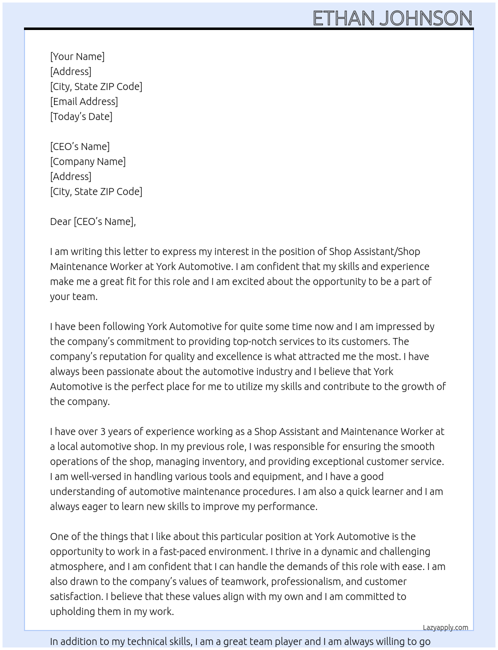 Shop Assistant/ shop maintenance worker Cover Letter At York automotive