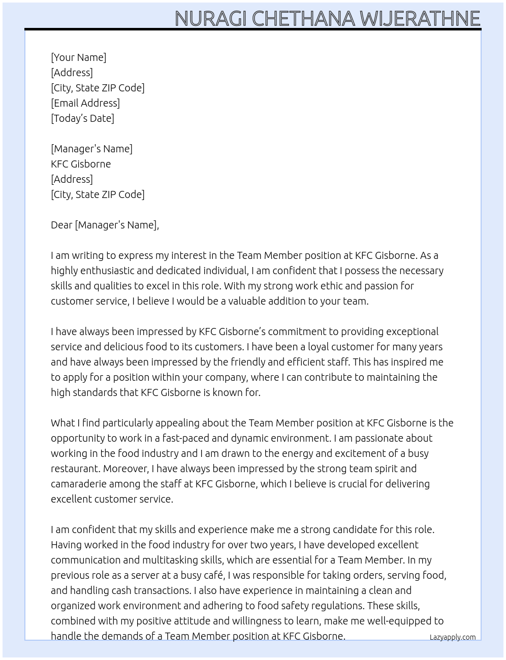 Team Member - KFC Gisborne Cover Letter At KFC Gisborne