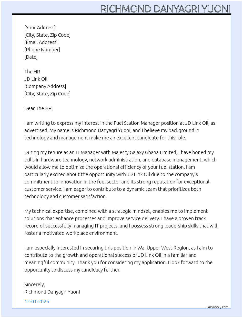 Cover letter for fuel station manager - LazyApply