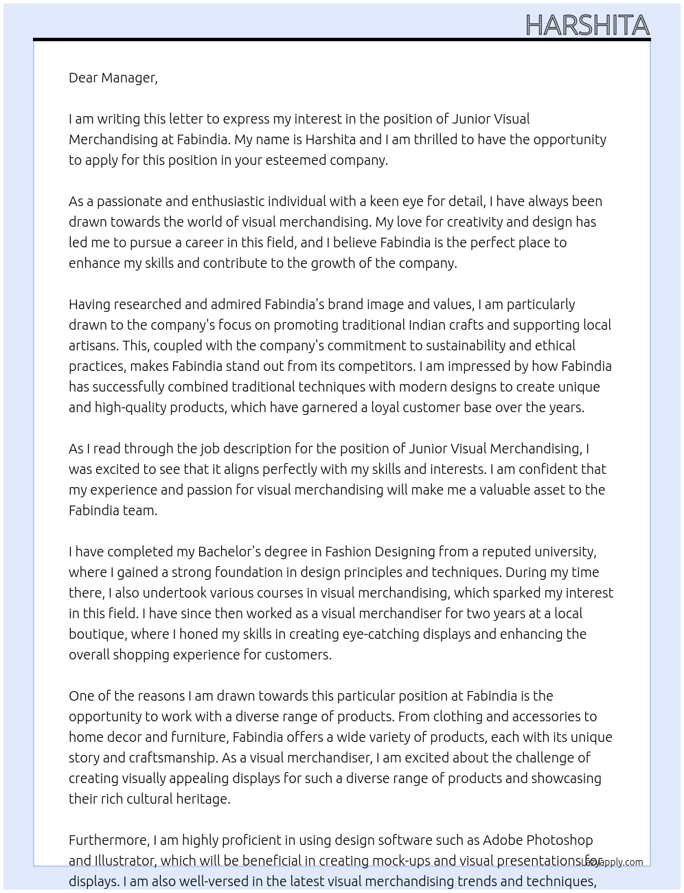 Check out these junior visual merchandising cover letter sample and examples previously used by job seekers to land on job interviews as junior visual merchandising. Use our AI cover letter generator to create a personalized cover letter as junior visual merchandising.