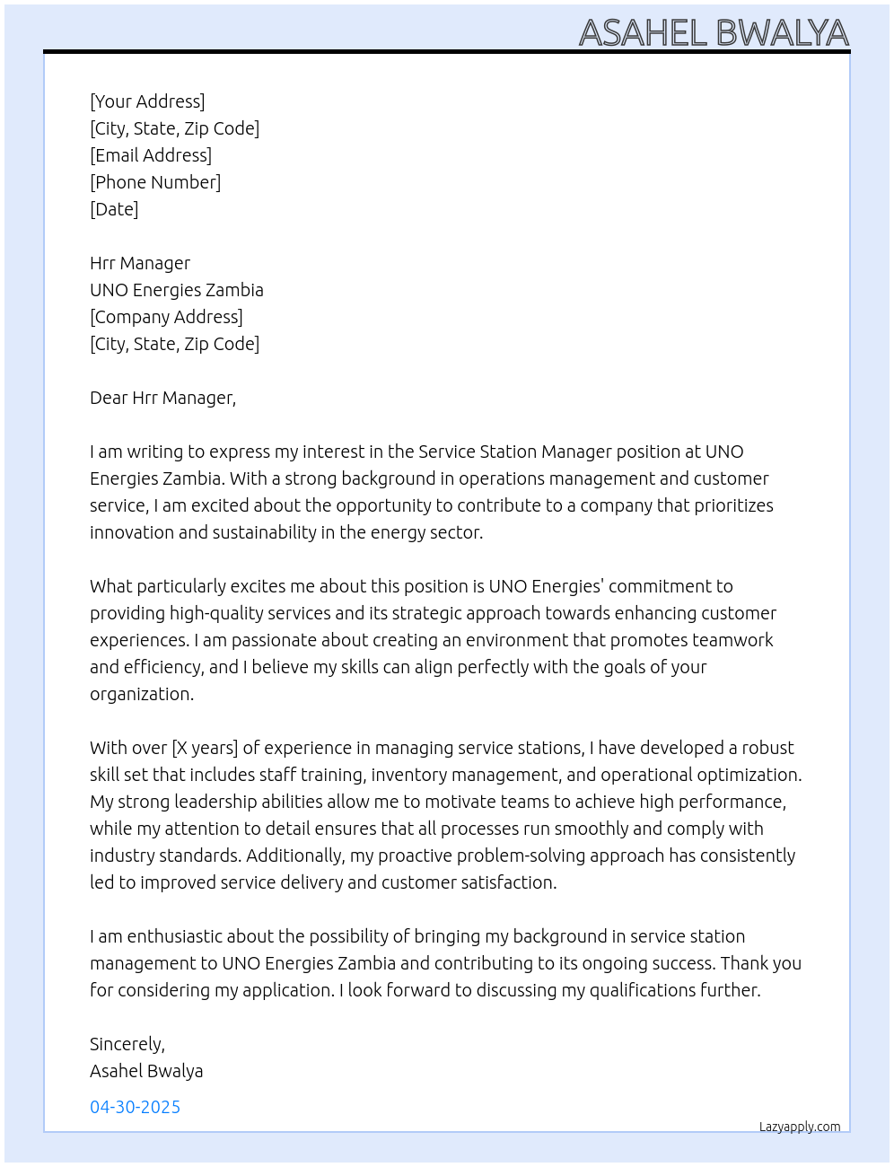 Check out these service station manager cover letter sample and examples previously used by job seekers to land on job interviews as service station manager. Use our AI cover letter generator to create a personalized cover letter as service station manager.