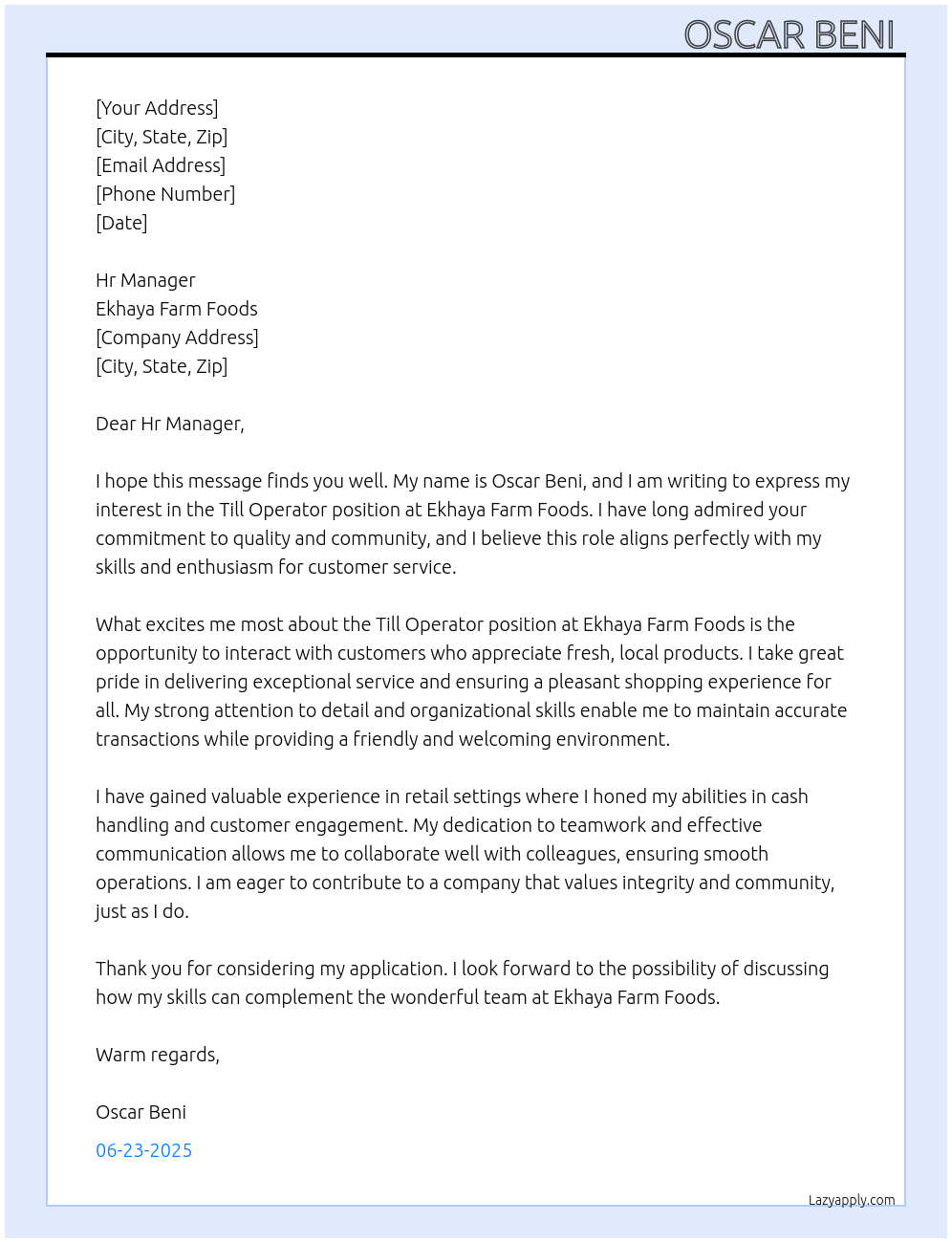 Check out these till operator cover letter sample and examples previously used by job seekers to land on job interviews as till operator. Use our AI cover letter generator to create a personalized cover letter as till operator.
