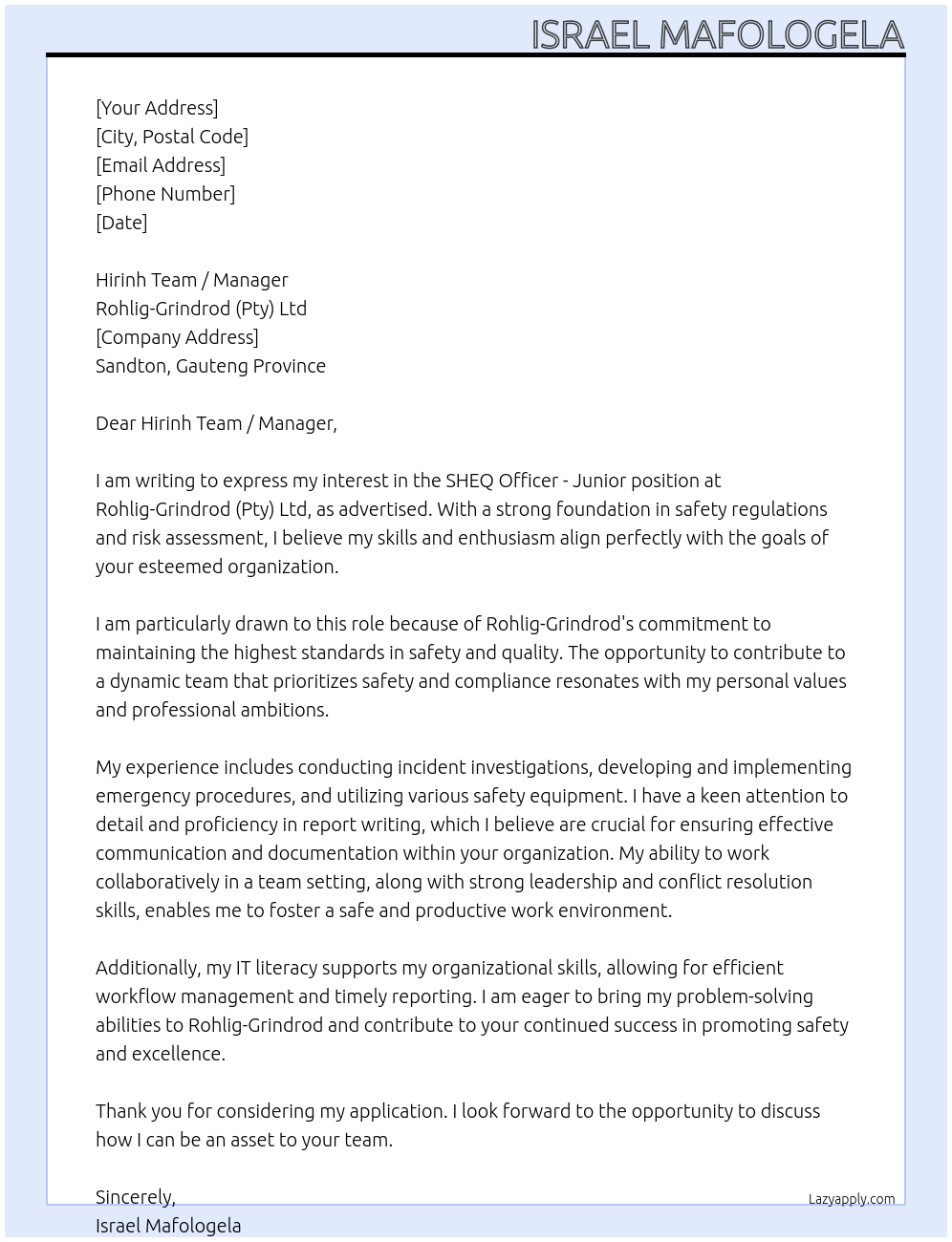 Sheq Officere - Junior Cover Letter Examples