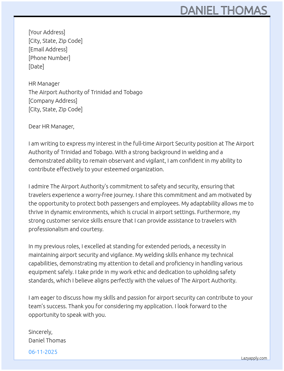 Check out these airport security cover letter sample and examples previously used by job seekers to land on job interviews as airport security. Use our AI cover letter generator to create a personalized cover letter as airport security.