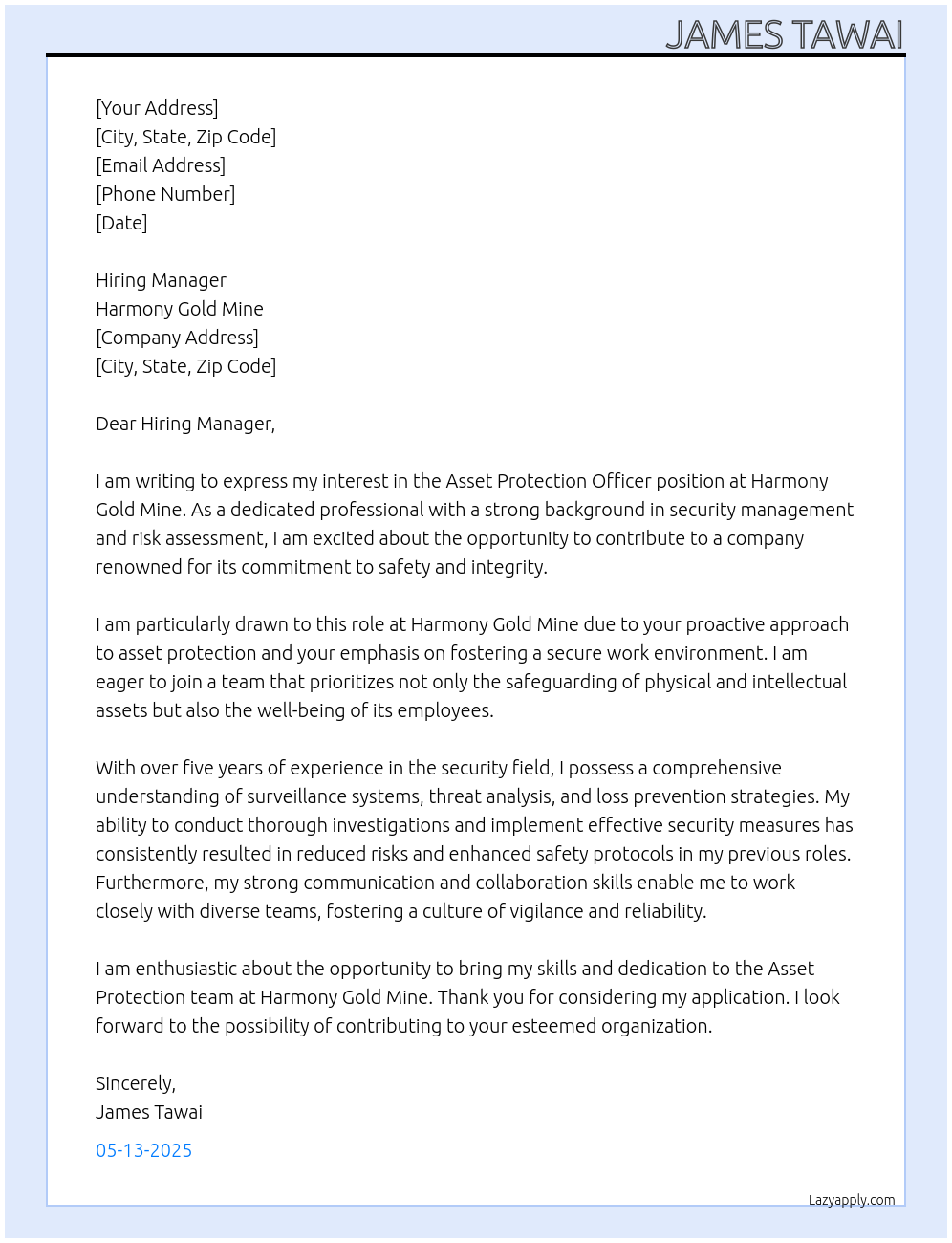 Asset Protection Officer Cover Letter At Asset Protection Officer with Harmony Gold Mine