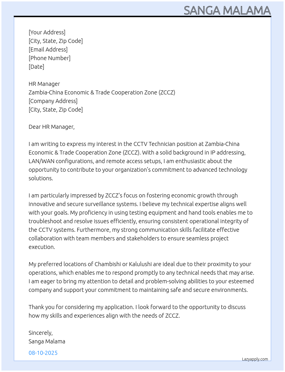 CCTV Technician Cover Letter At Zambia-China Economic & Trade Cooperation Zone (ZCCZ)