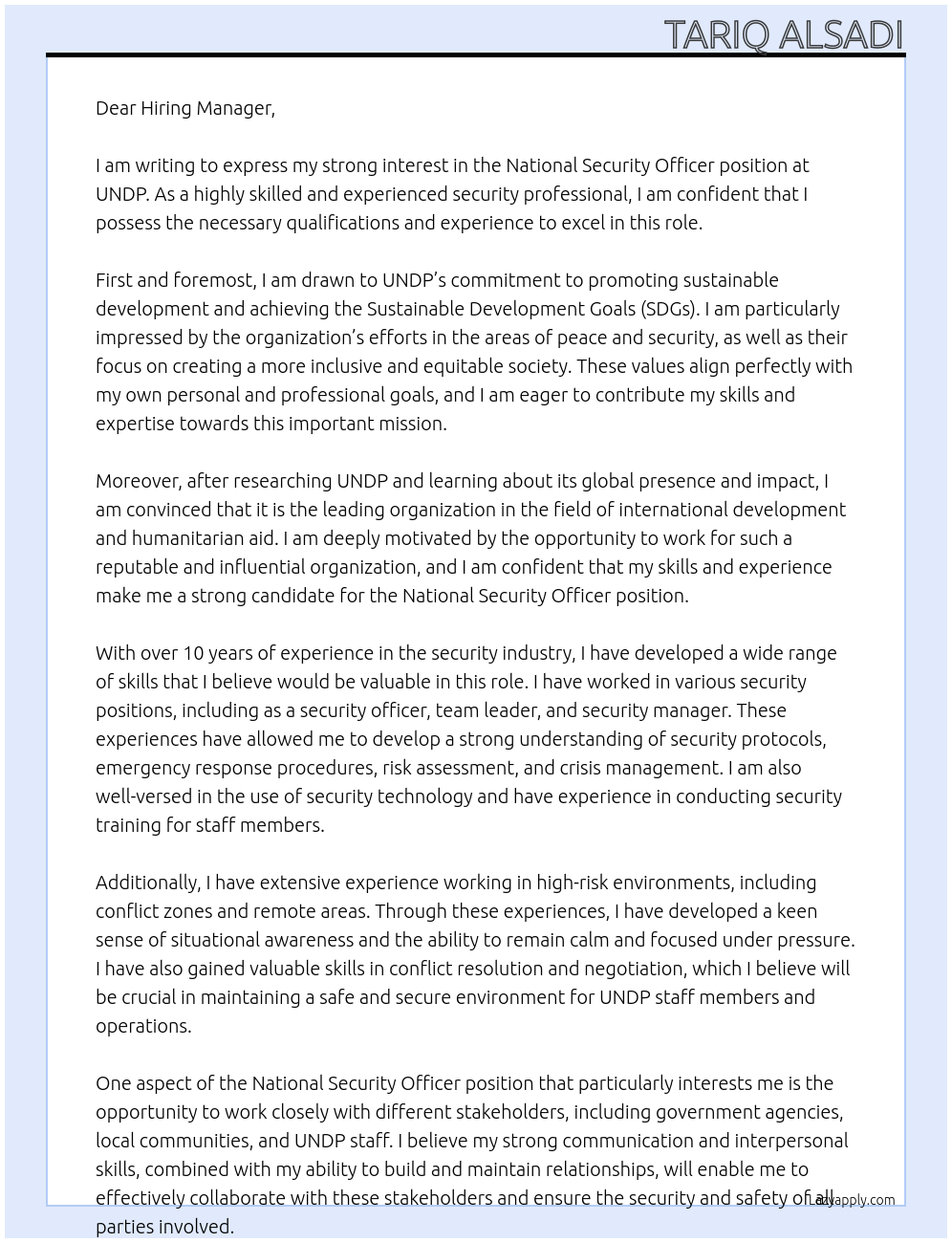Check out these national security officer cover letter sample and examples previously used by job seekers to land on job interviews as national security officer. Use our AI cover letter generator to create a personalized cover letter as national security officer.