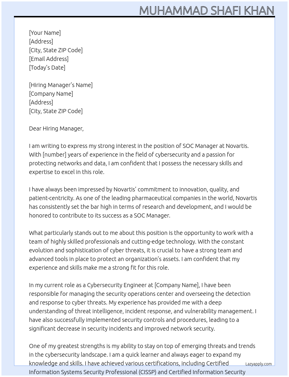 SOC Manager At Novartis Cover Letter