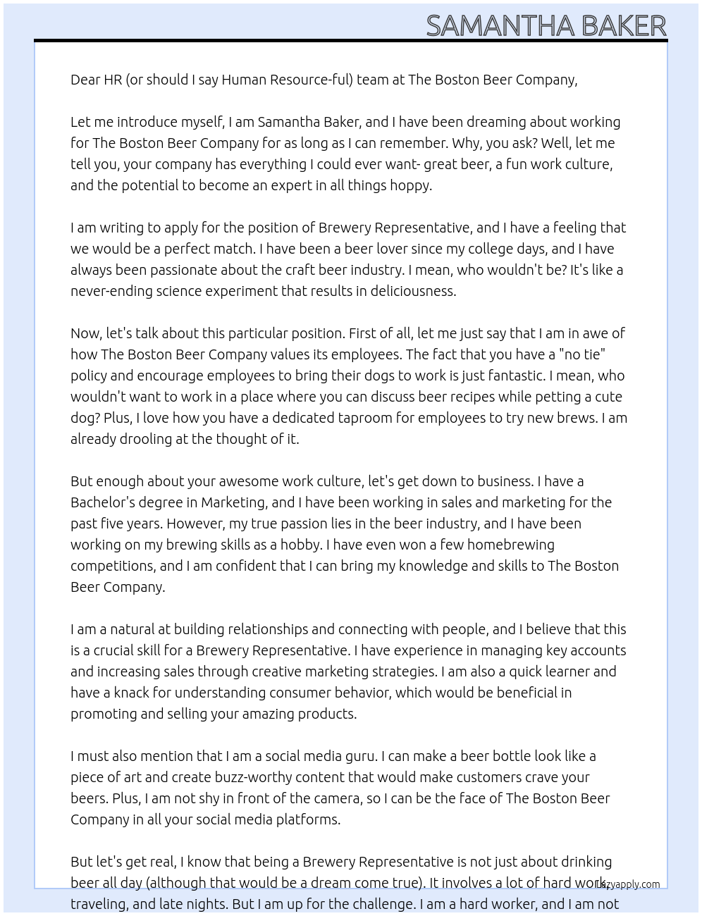 Check out these brewery representative cover letter sample and examples previously used by job seekers to land on job interviews as brewery representative. Use our AI cover letter generator to create a personalized cover letter as brewery representative.