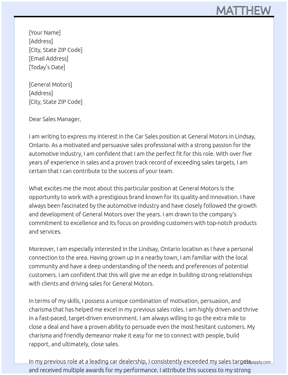 Car sales Cover Letter At General Motors