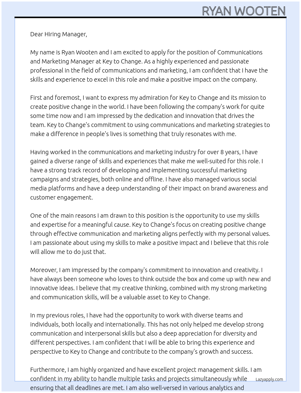 Communications and Marketing Manager Cover Letter At Key to Change