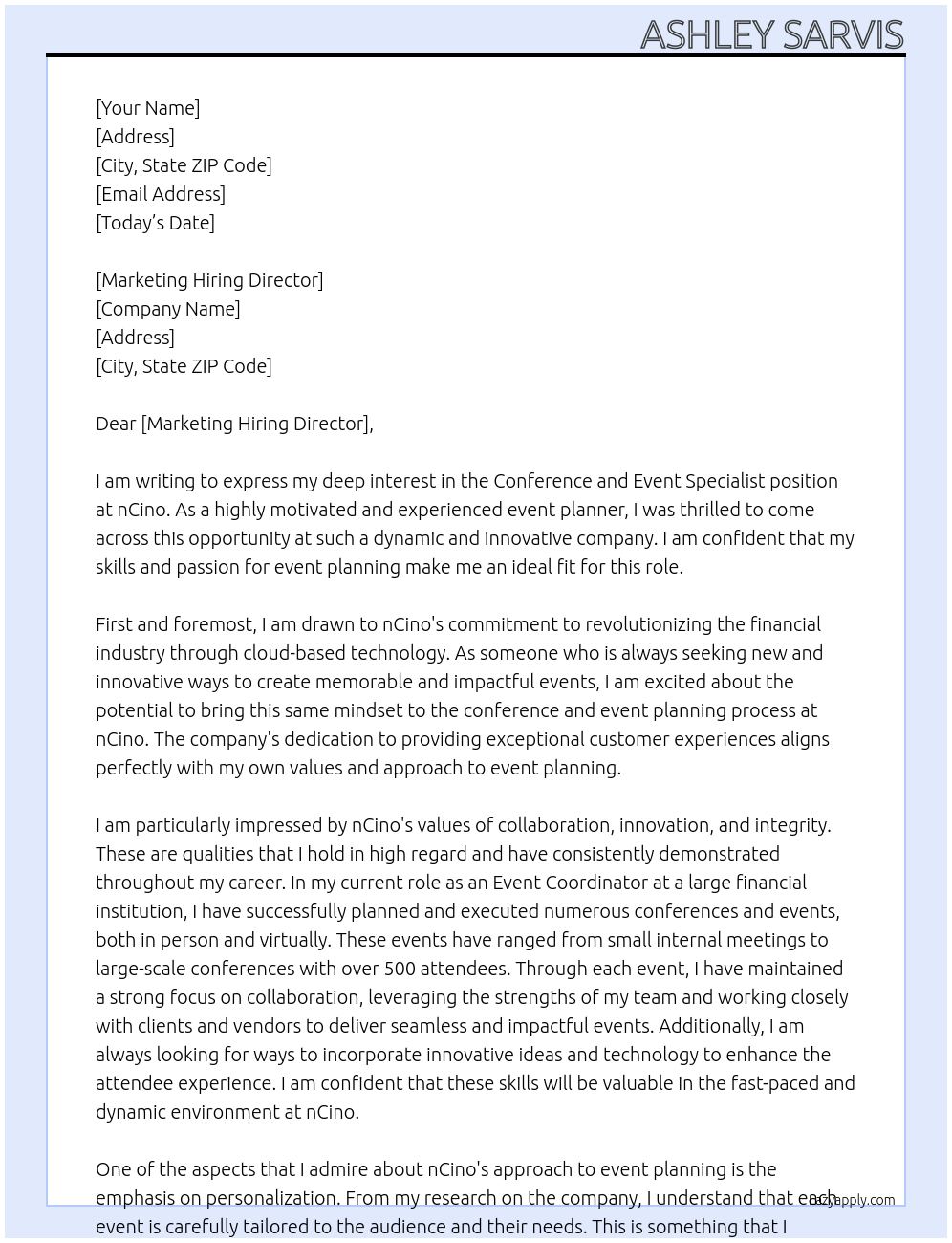 Check out these conference and event specialist cover letter sample and examples previously used by job seekers to land on job interviews as conference and event specialist. Use our AI cover letter generator to create a personalized cover letter as conference and event specialist.