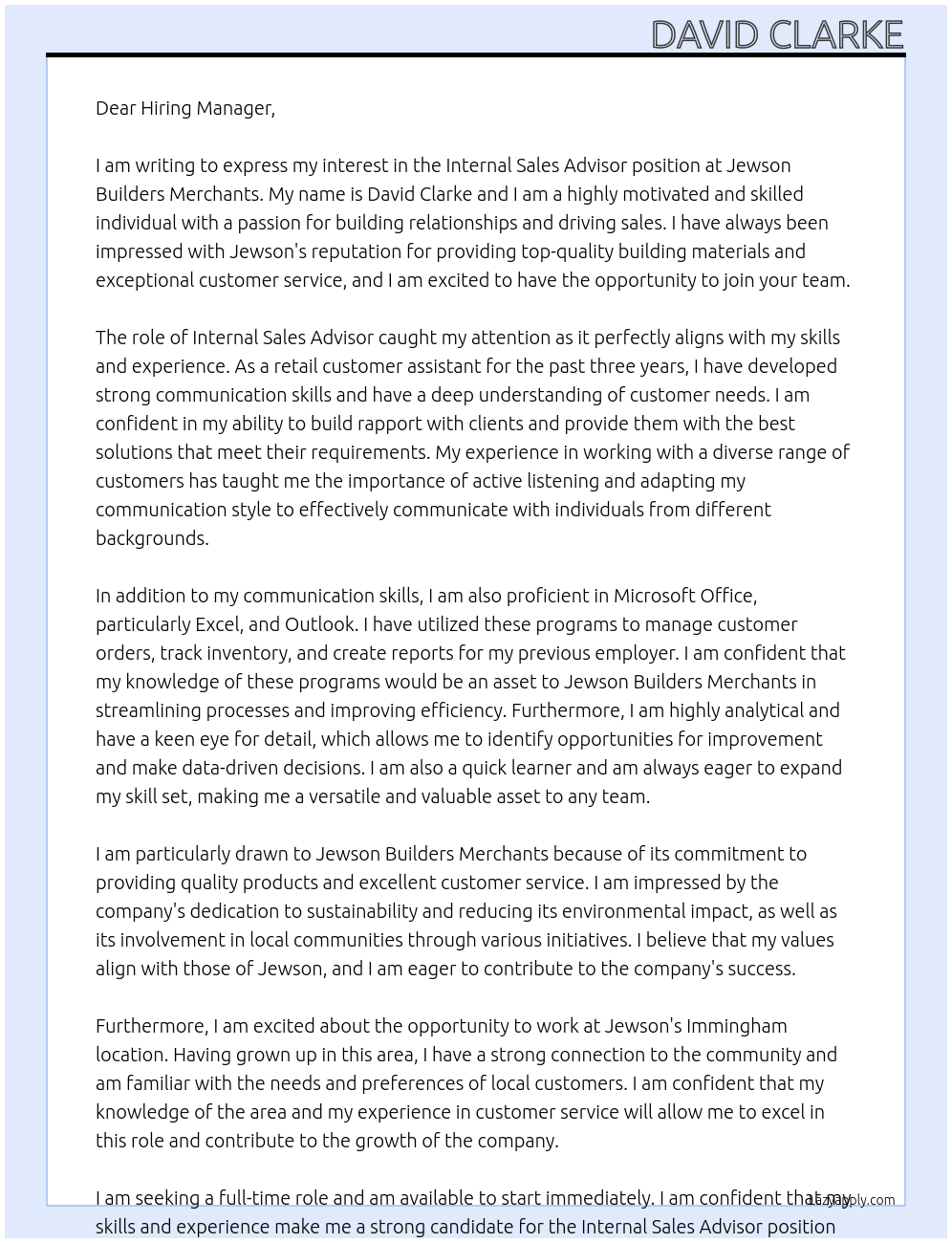 Internal Sales Advisor Cover Letter At Jewson Builders Merchants