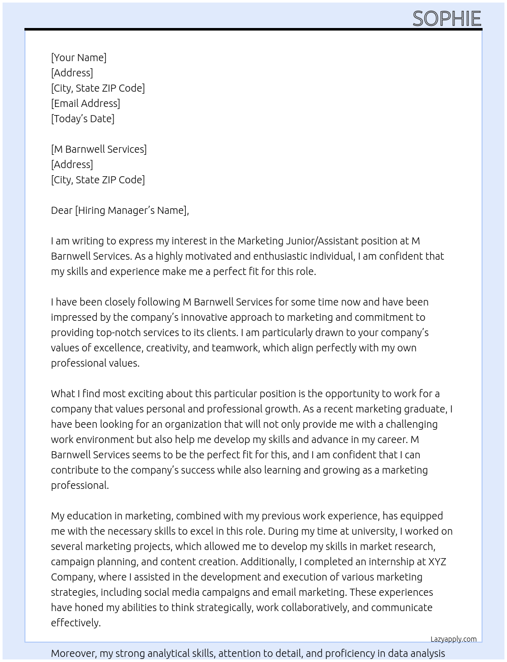 Marketing Junior / Assistant Cover Letter At M Barnwell Services
