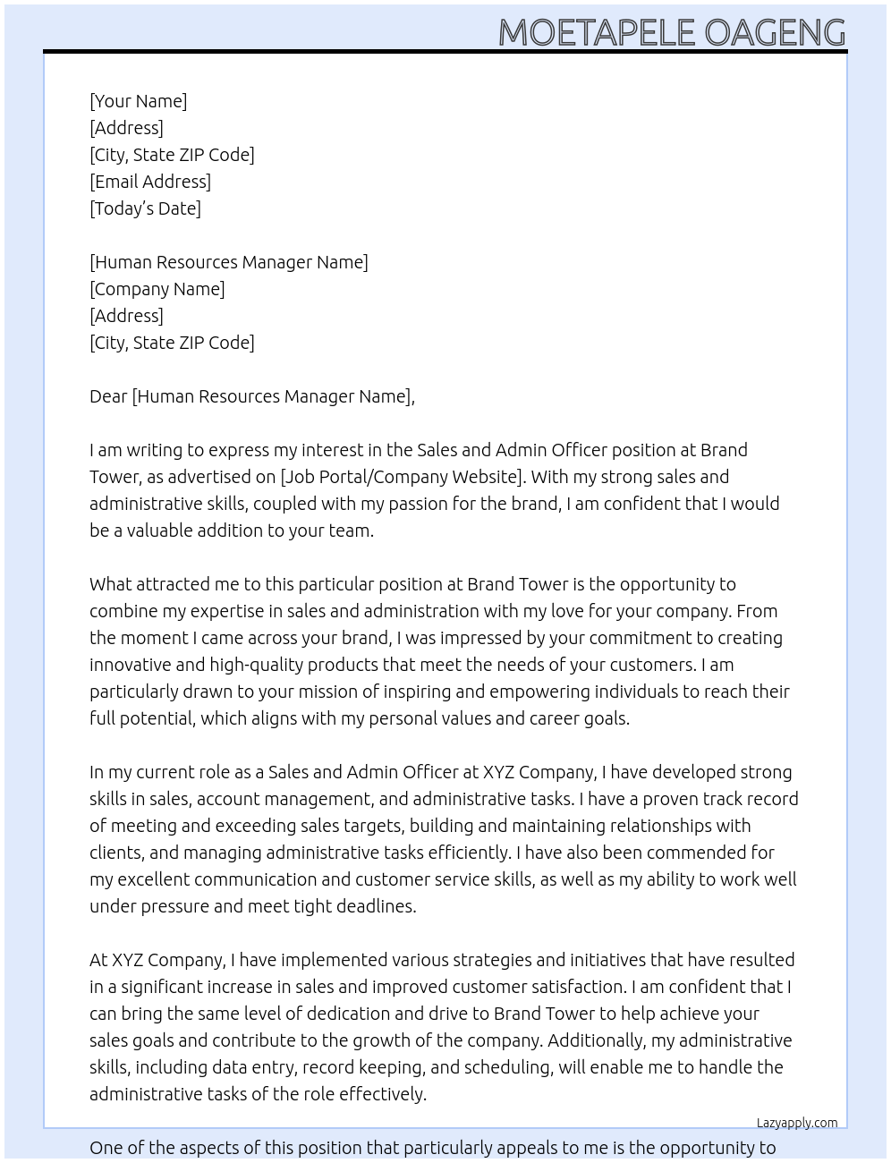 Check out these sales and admin officer cover letter sample and examples previously used by job seekers to land on job interviews as sales and admin officer. Use our AI cover letter generator to create a personalized cover letter as sales and admin officer.