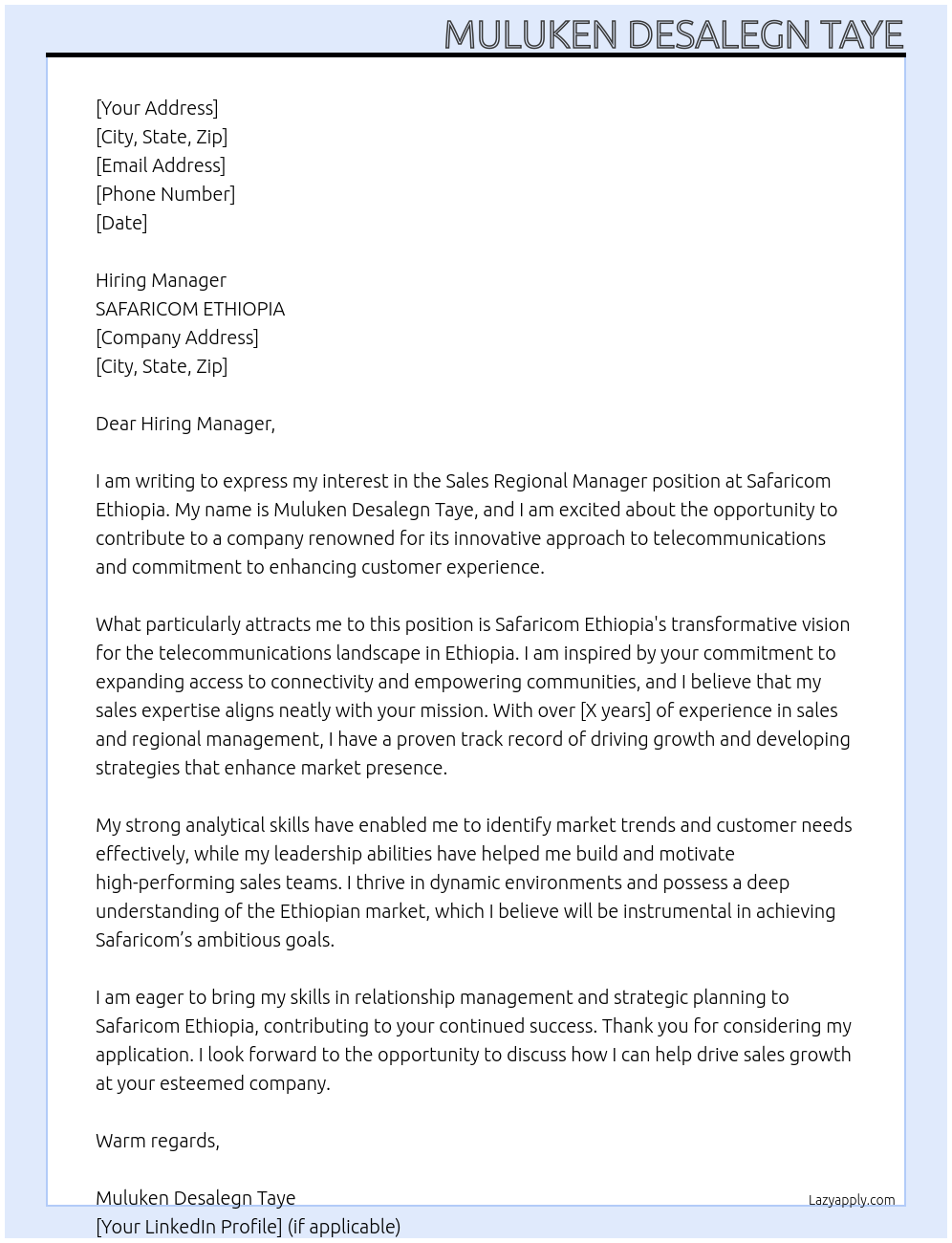 Sales regional mannager Cover Letter At SAFARICOM ETHIOPIA