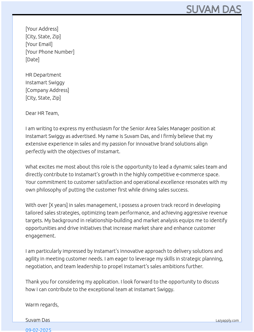 SENIOR AREA SALES MANAGER Cover Letter At INSTAMART SWIGGY