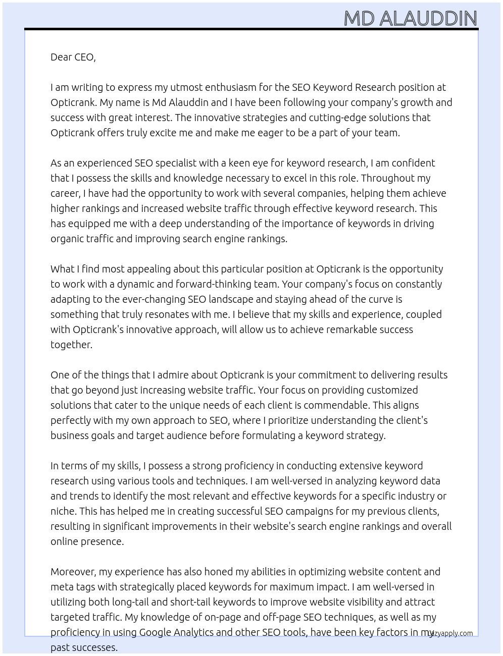 Check out these seo keyword research cover letter sample and examples previously used by job seekers to land on job interviews as seo keyword research. Use our AI cover letter generator to create a personalized cover letter as seo keyword research.