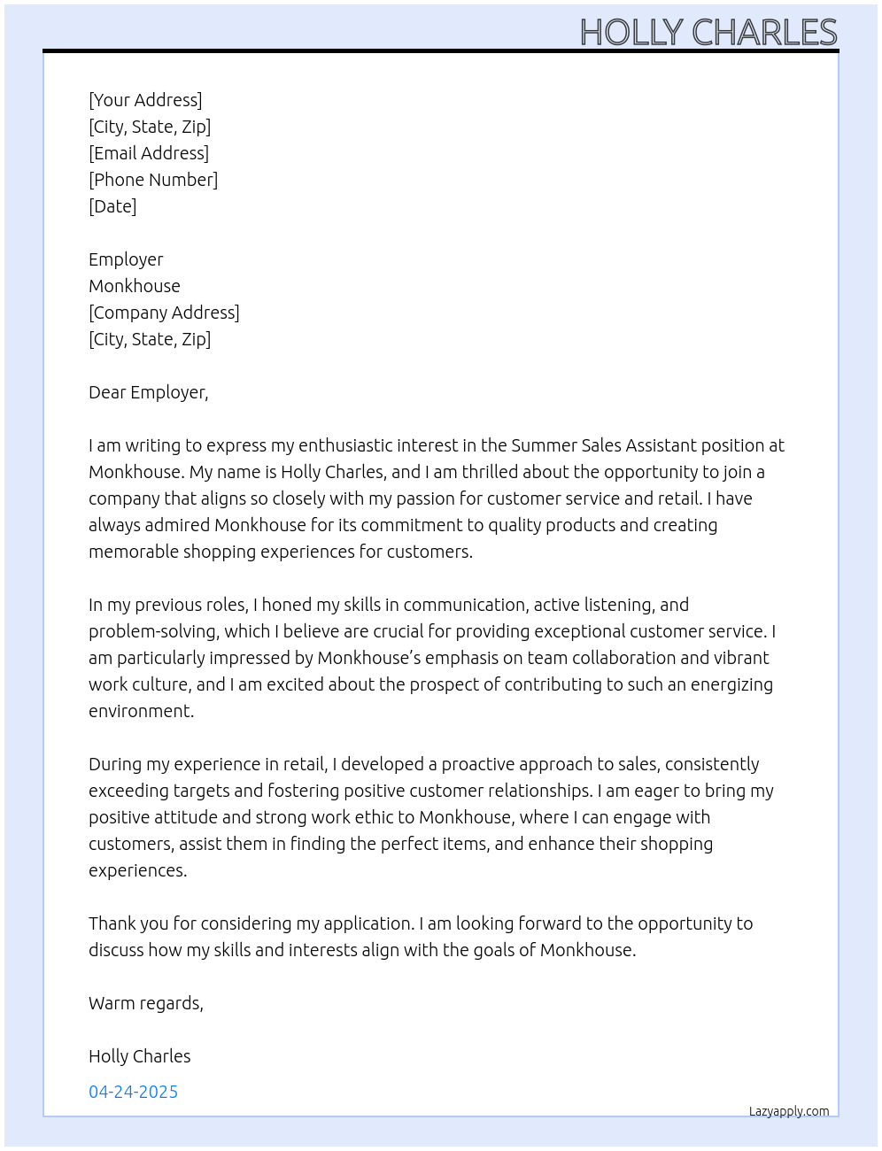 Summer Sales Assistant Cover Letter At Monkhouse Schoolwear