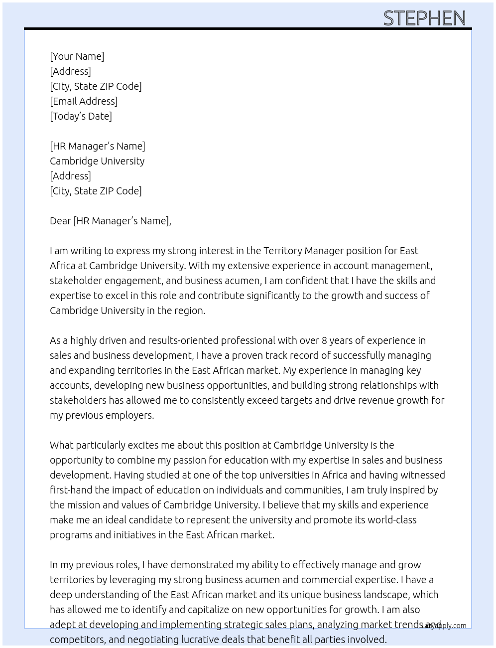 Check out these territory manager east africa cover letter sample and examples previously used by job seekers to land on job interviews as territory manager east africa. Use our AI cover letter generator to create a personalized cover letter as territory manager east africa.
