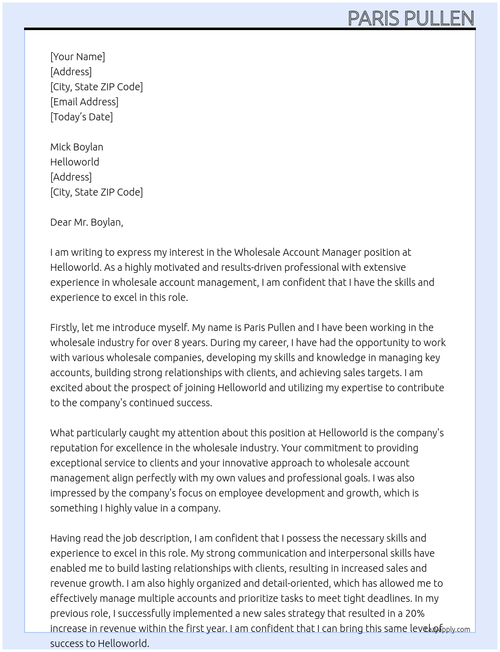 Check out these wholesale account manager cover letter sample and examples previously used by job seekers to land on job interviews as wholesale account manager. Use our AI cover letter generator to create a personalized cover letter as wholesale account manager.