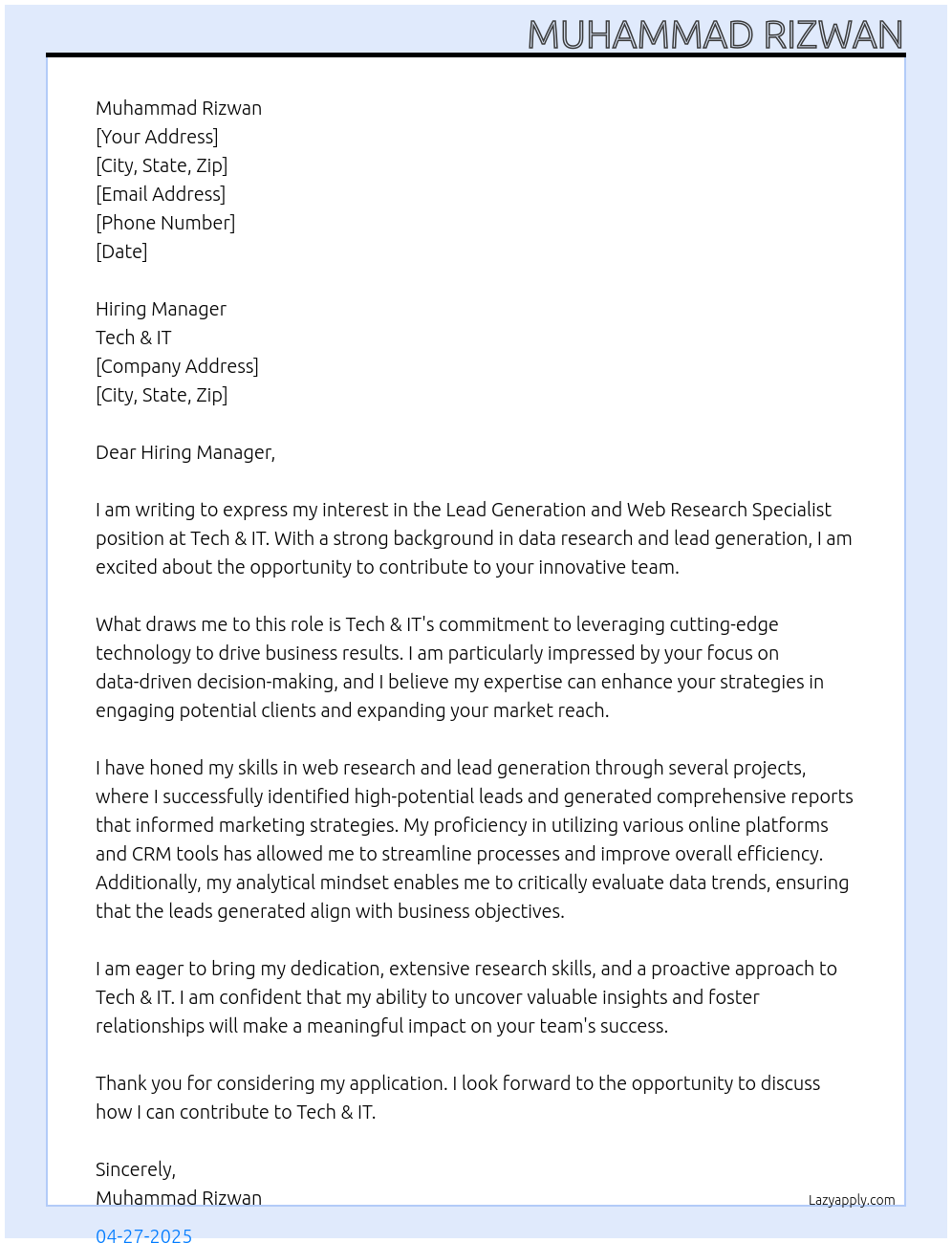 Lead Generation and Web Research Specialist Cover Letter At Tech & IT