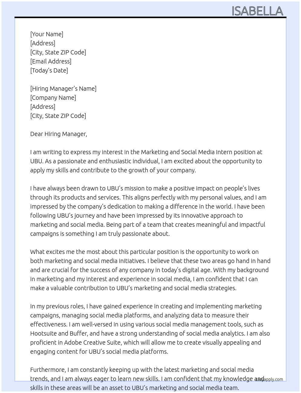 Marketing and Social Media Intern Cover Letter At UBU