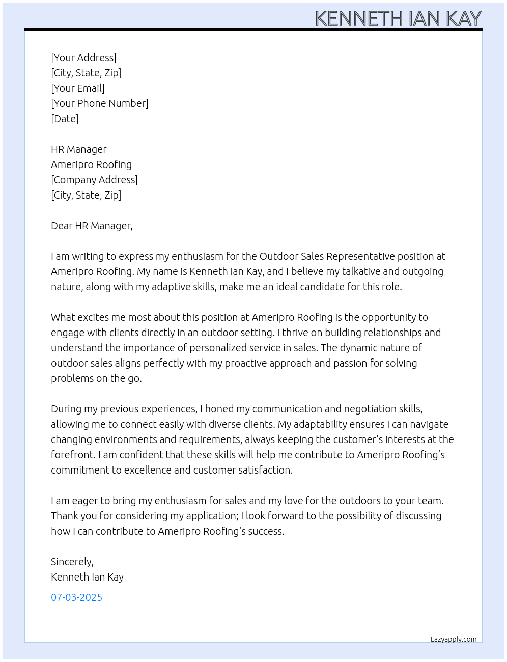 Check out these outdoor sales representative cover letter sample and examples previously used by job seekers to land on job interviews as outdoor sales representative. Use our AI cover letter generator to create a personalized cover letter as outdoor sales representative.