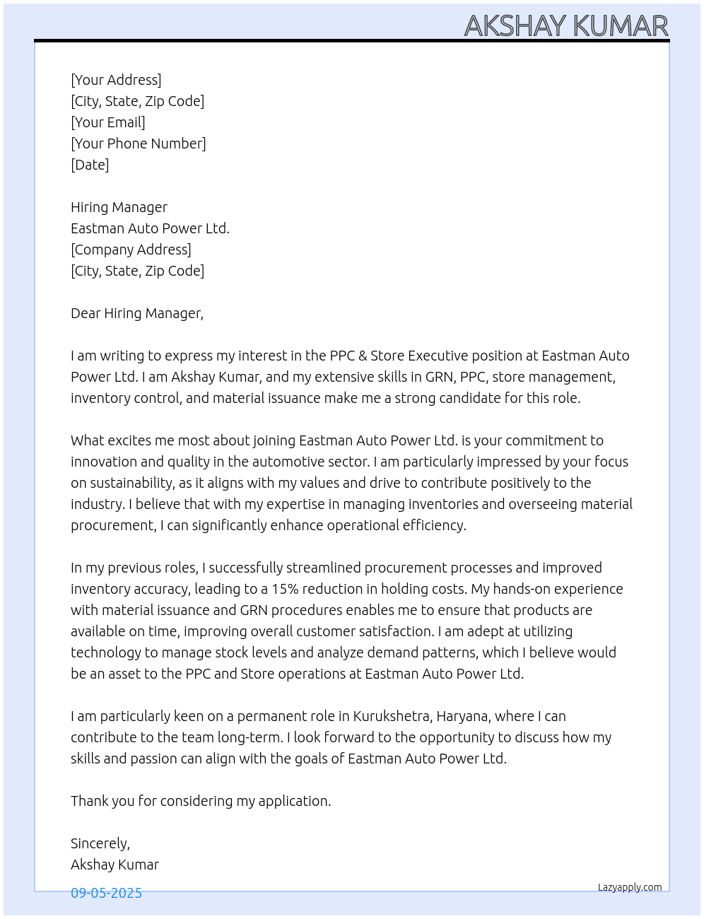 PPC & Store Cover Letter At Eastman Auto Power Ltd.