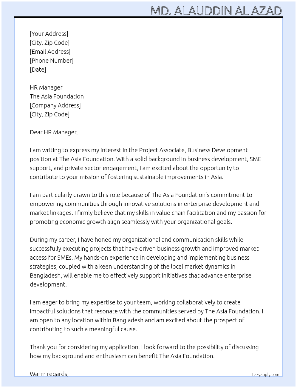 Cover letter for project associate, business development - LazyApply