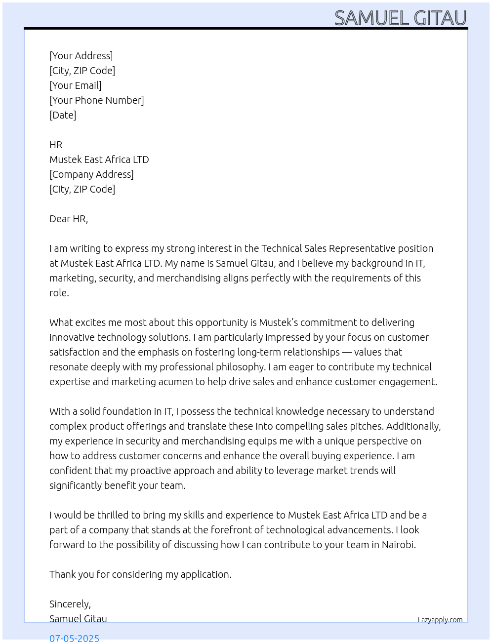 Technical sales representative At Mustek EastAfrica LTD Cover Letter