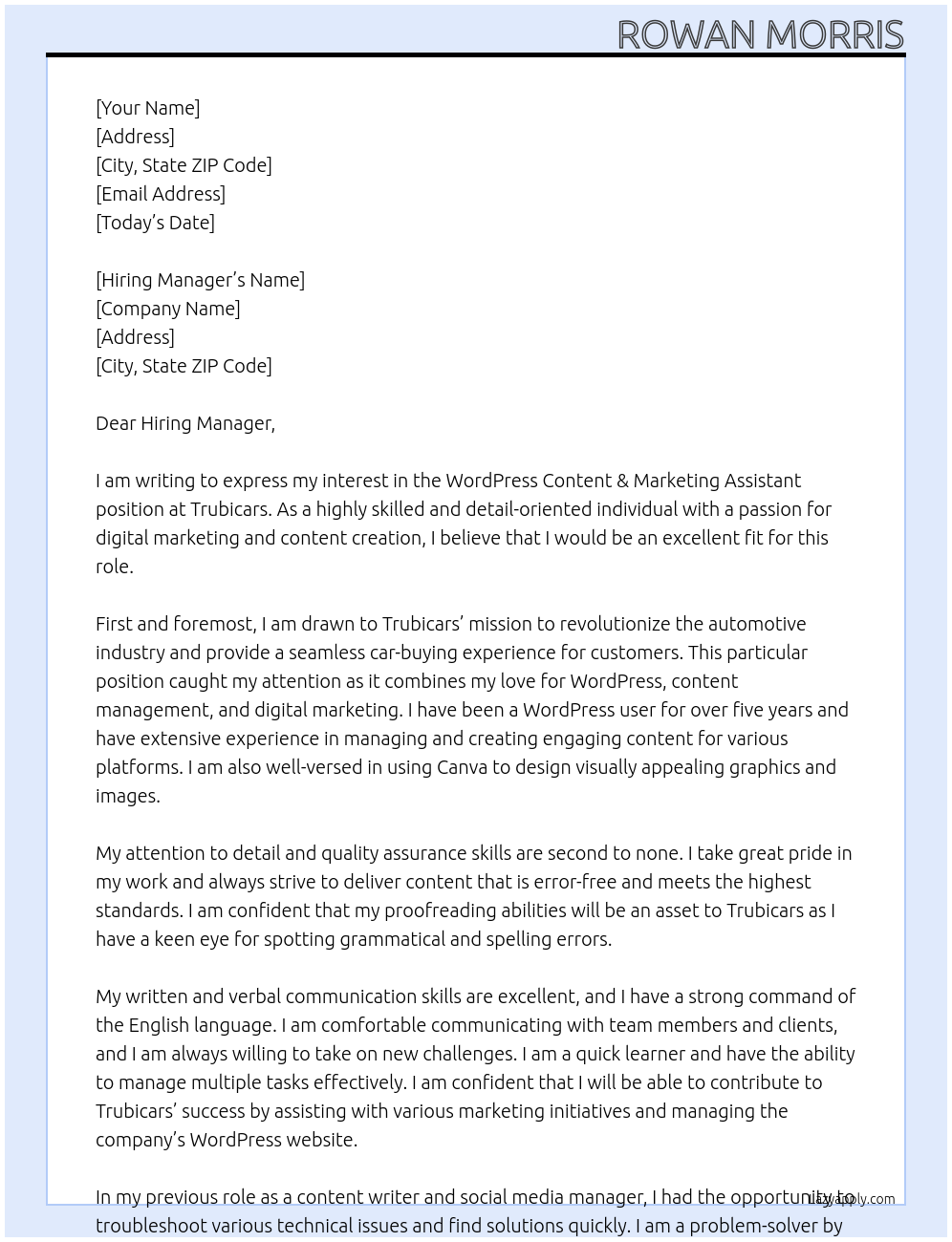 WordPress Content & Marketing Assistant Cover Letter At Trubicars