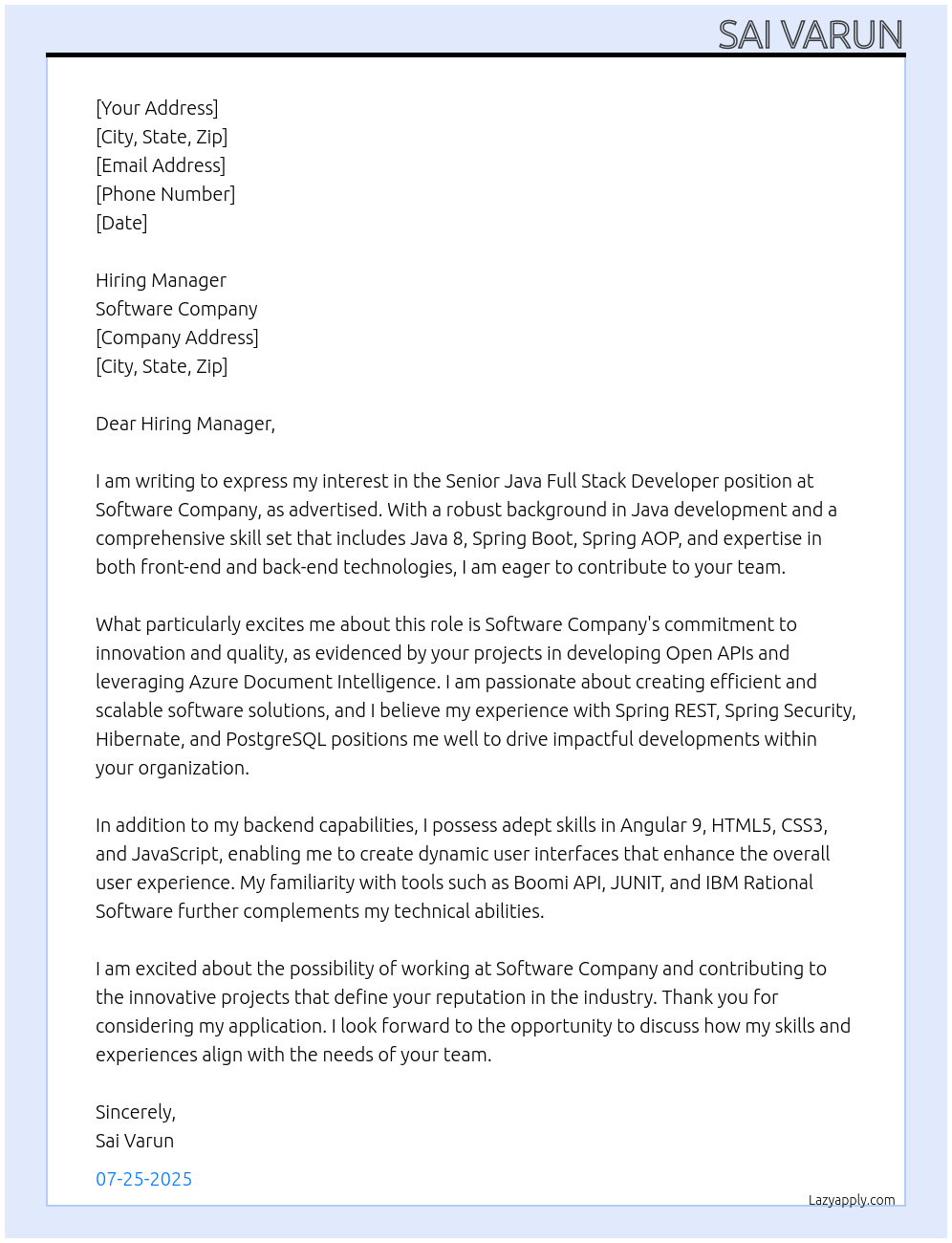 Check out these senior java full stack developer cover letter sample and examples previously used by job seekers to land on job interviews as senior java full stack developer. Use our AI cover letter generator to create a personalized cover letter as senior java full stack developer.