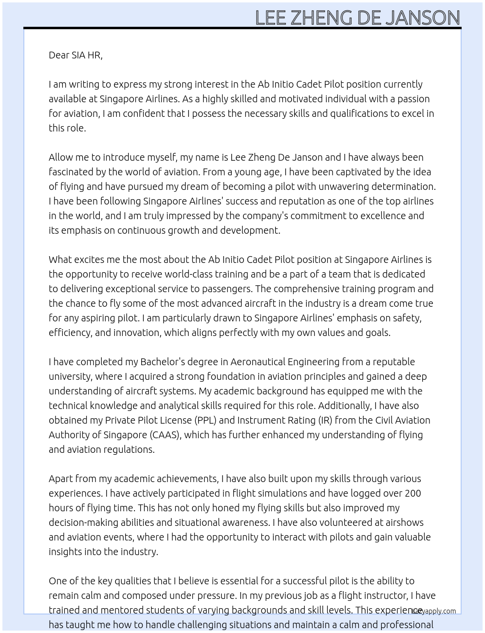 Ab Initio Cadet Pilot Cover Letter At Singapore Airlines