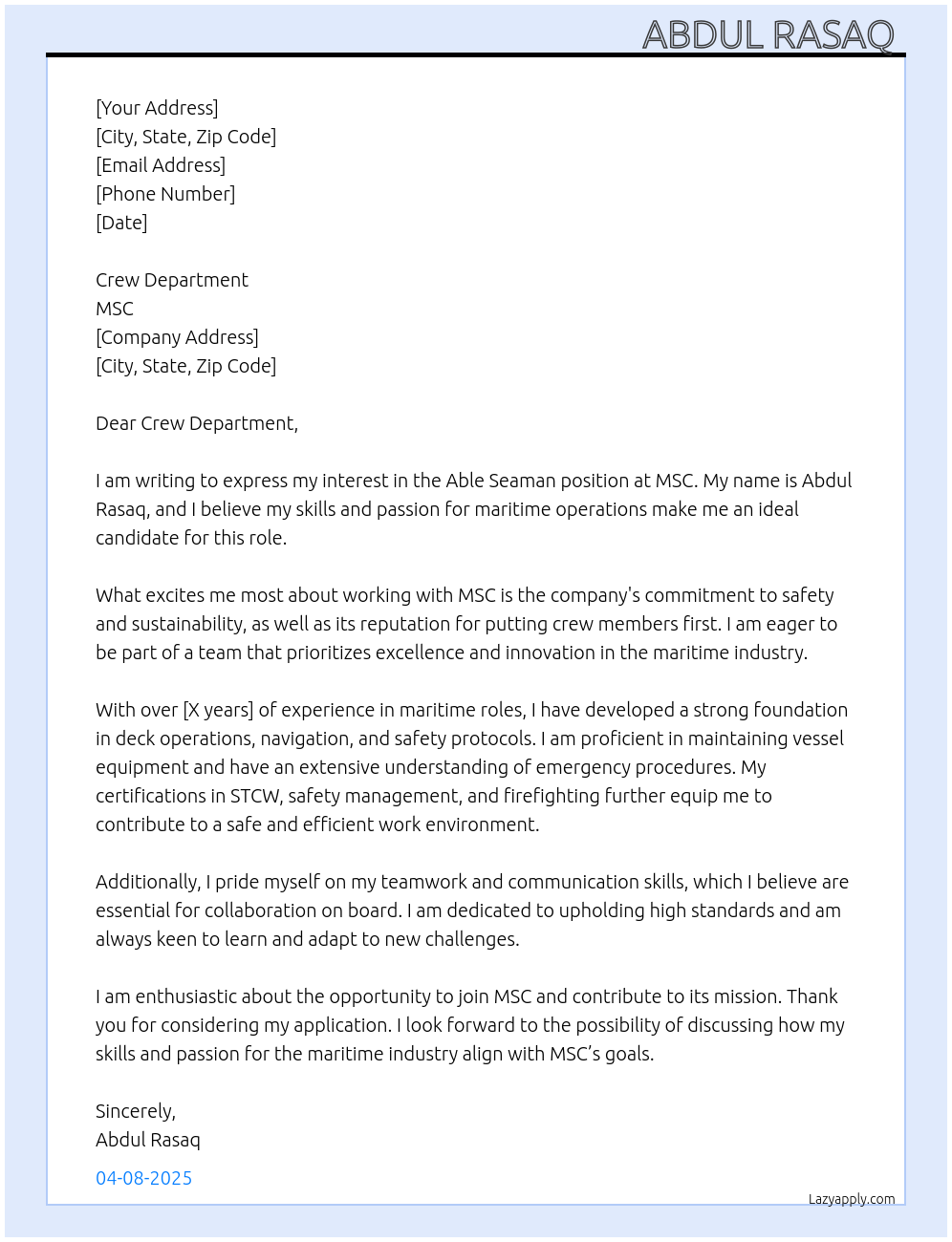 Check out these able seaman cover letter sample and examples previously used by job seekers to land on job interviews as able seaman. Use our AI cover letter generator to create a personalized cover letter as able seaman.