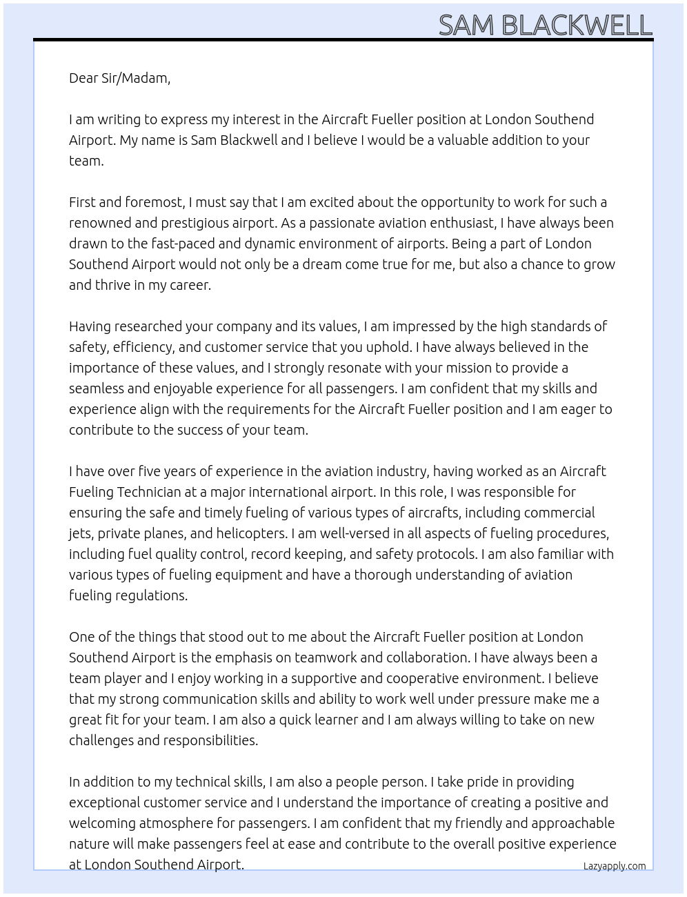 Check out these aircraft fueller cover letter sample and examples previously used by job seekers to land on job interviews as aircraft fueller. Use our AI cover letter generator to create a personalized cover letter as aircraft fueller.