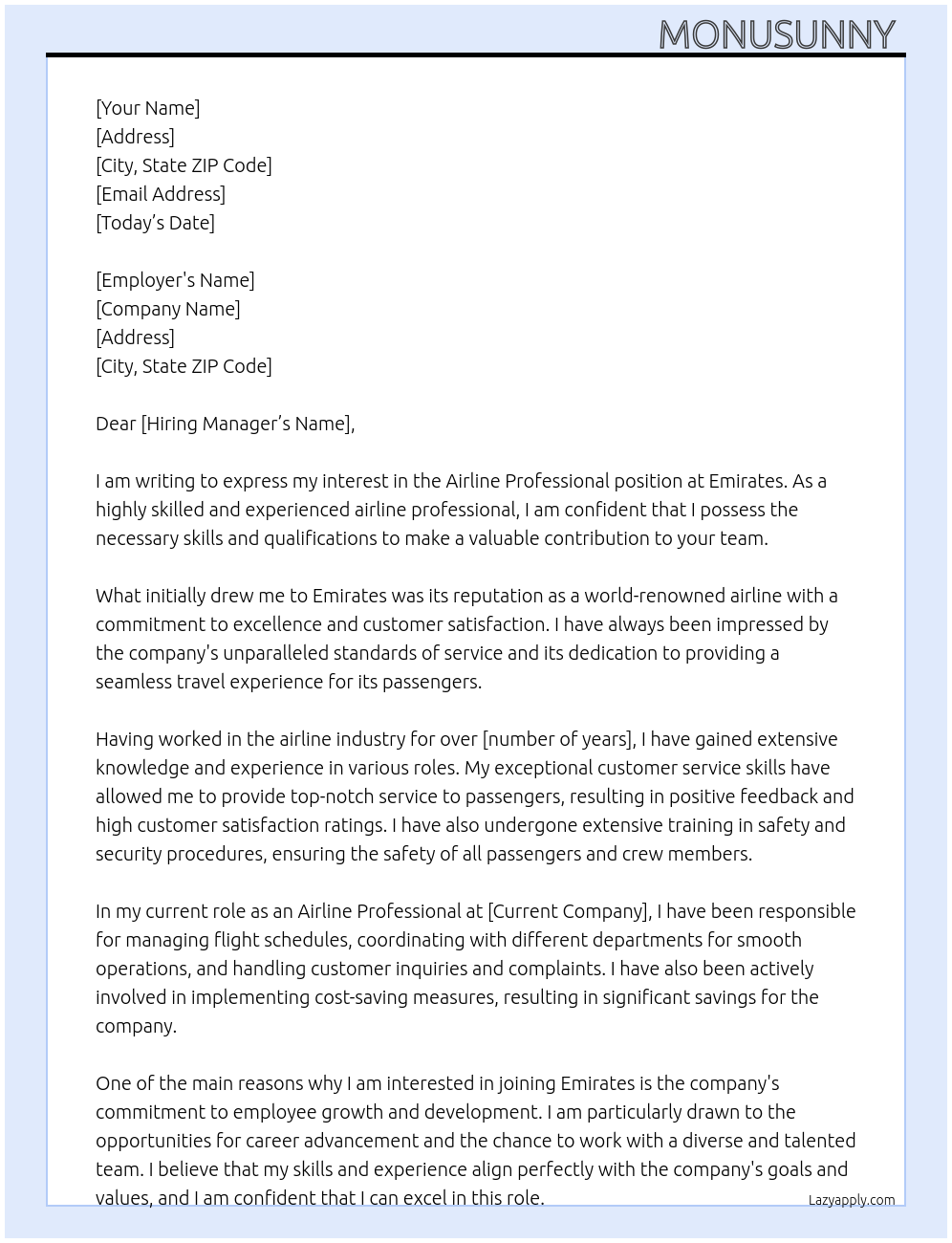 Check out these airline professional cover letter sample and examples previously used by job seekers to land on job interviews as airline professional. Use our AI cover letter generator to create a personalized cover letter as airline professional.