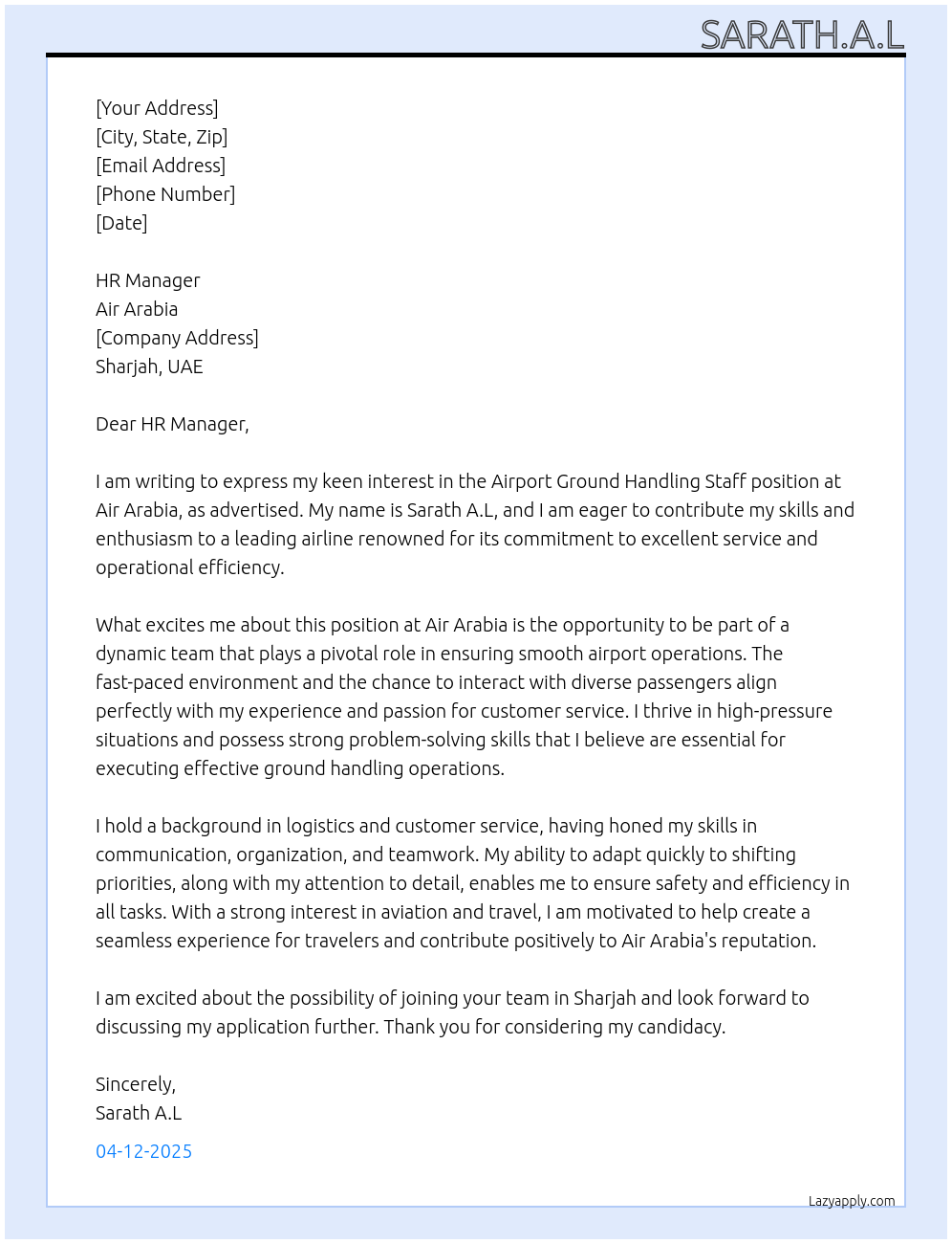 Check out these airport ground handling staff cover letter sample and examples previously used by job seekers to land on job interviews as airport ground handling staff. Use our AI cover letter generator to create a personalized cover letter as airport ground handling staff.