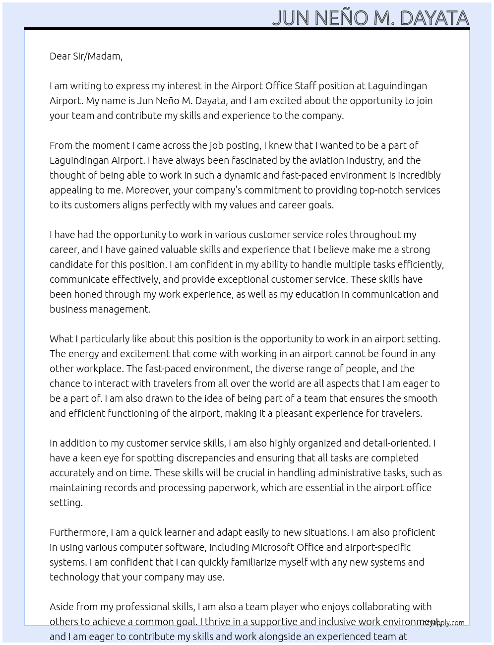 Airport office staff Cover Letter At Laguindingan airport