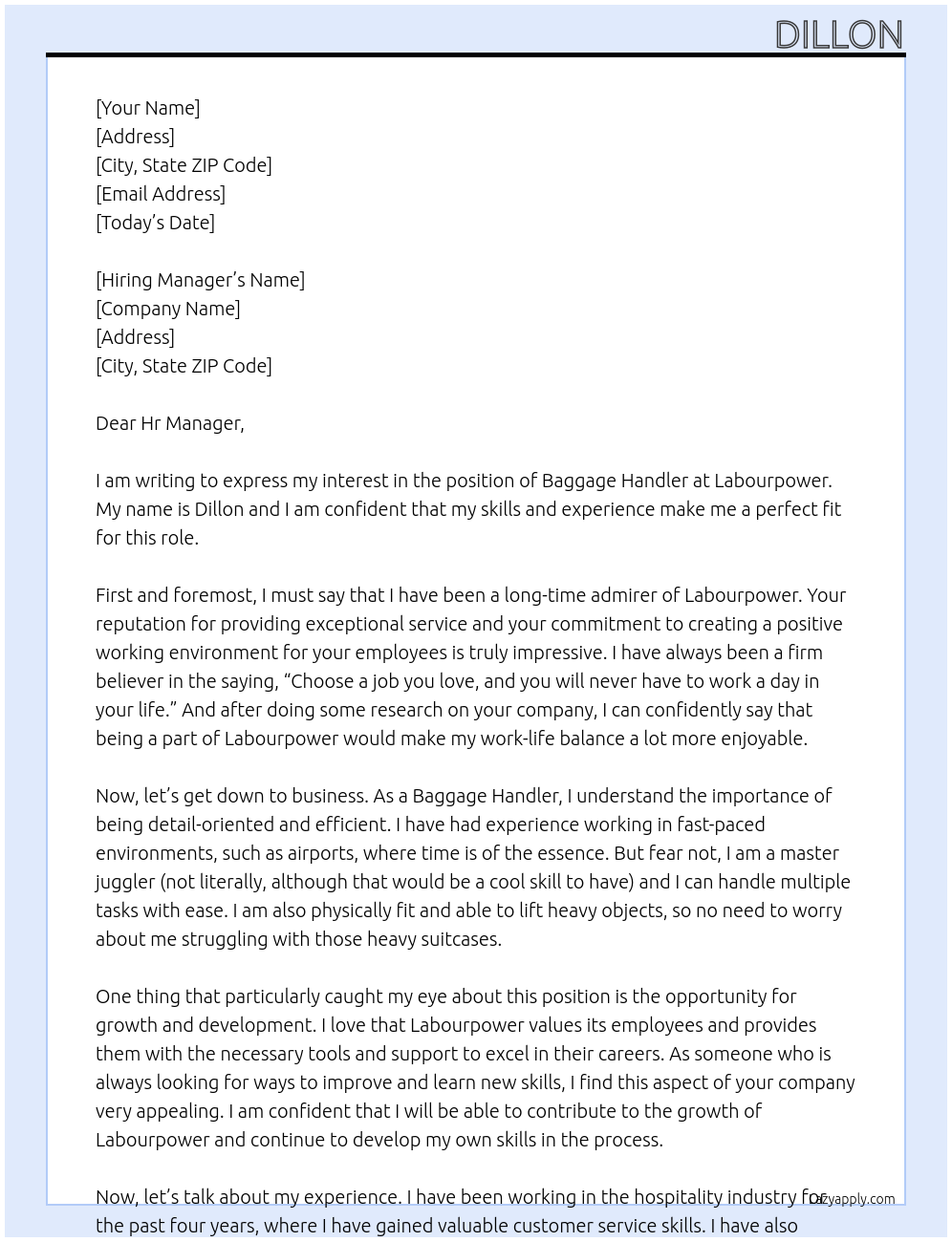 Check out these baggage handler cover letter sample and examples previously used by job seekers to land on job interviews as baggage handler. Use our AI cover letter generator to create a personalized cover letter as baggage handler.