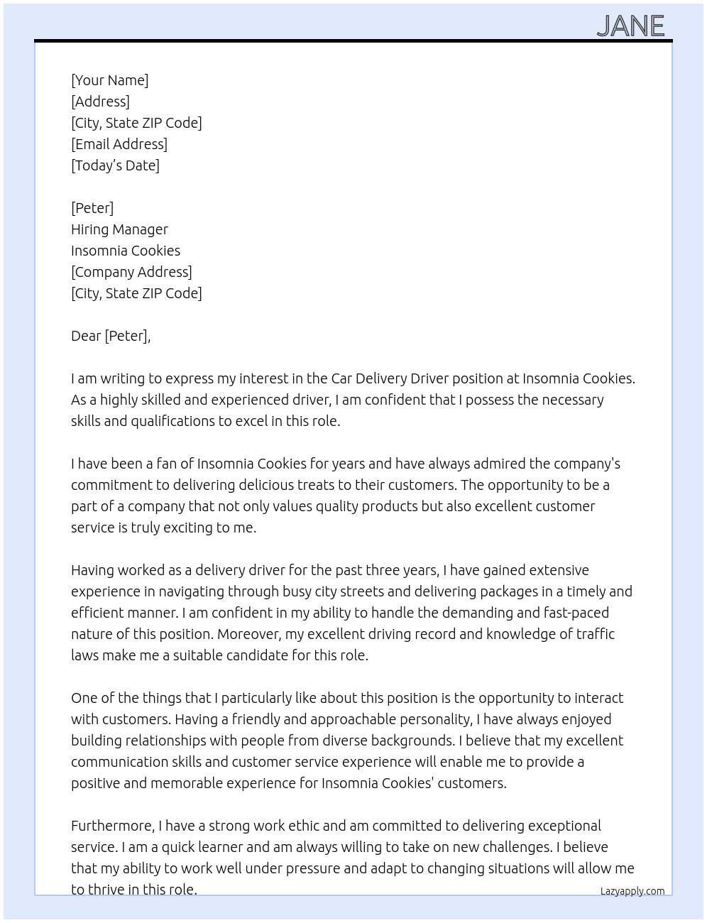 Car delivery driver Cover Letter At Insomnia Cookies