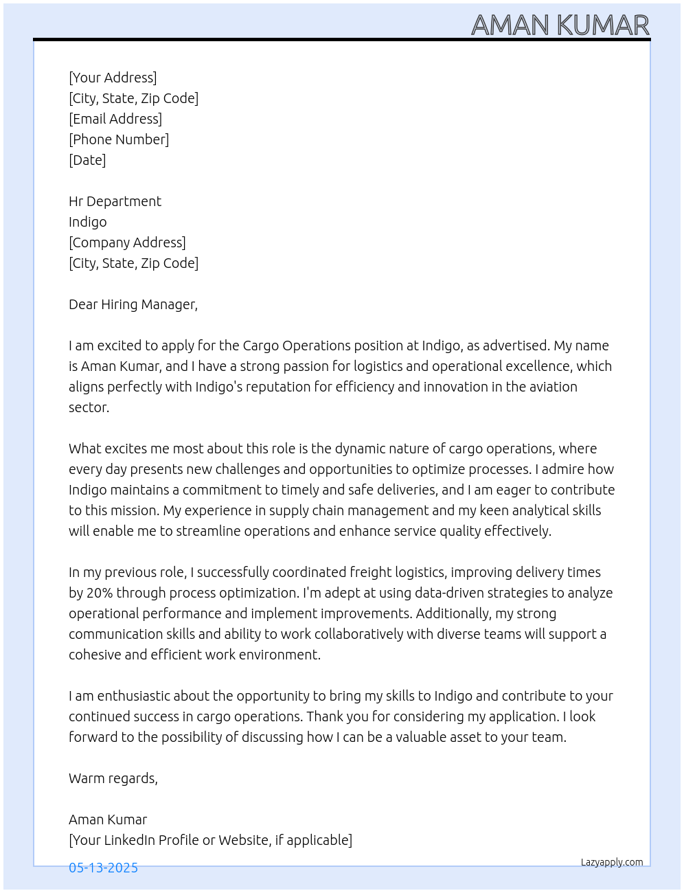 Cargo operations Cover Letter At InterGlobe Aviation Ltd