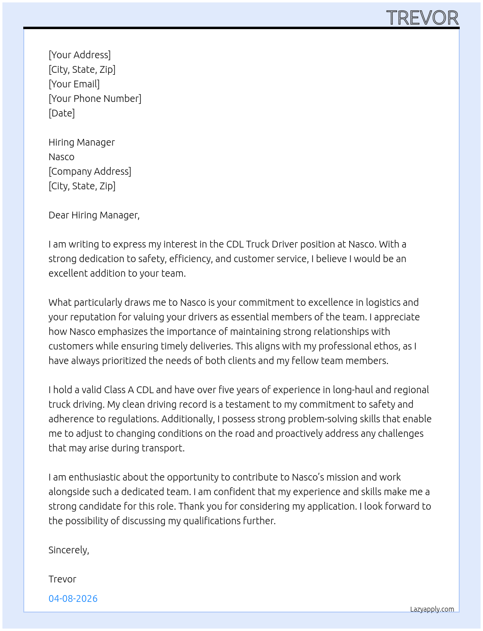 Check out these cdl truck driver cover letter sample and examples previously used by job seekers to land on job interviews as cdl truck driver. Use our AI cover letter generator to create a personalized cover letter as cdl truck driver.
